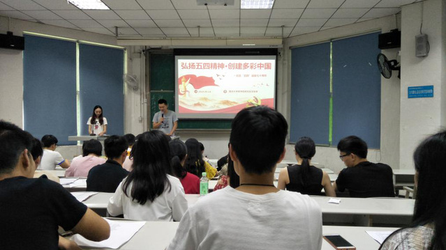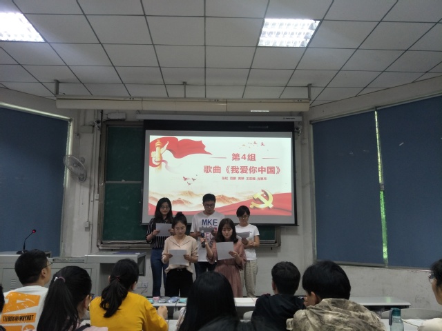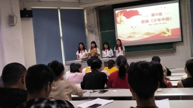 首先,主持人进行活动背景及意义的介绍。伟大的五四青年运动已经过去一百周年,在这段历史的时空里,一群群热血的中华儿女,高举爱国主义的旗帜,扬着民主和科学的理念,舍生忘死,浴血奋战,掀起了思想解放的新篇章。今天,我们在这里用歌声和诗词弘扬五四精神,展现我们青年的风采。接下来,由党员、积极分子组成的八个小组依次表演。感同身受的歌词、倾注感情的朗诵,让我们不禁沉浸在对祖国的炽热、真挚、高尚的情感中。八个节目各有特色,每一个节目都创意十足,展现着对五四精神的传承和对祖国的美好期待。