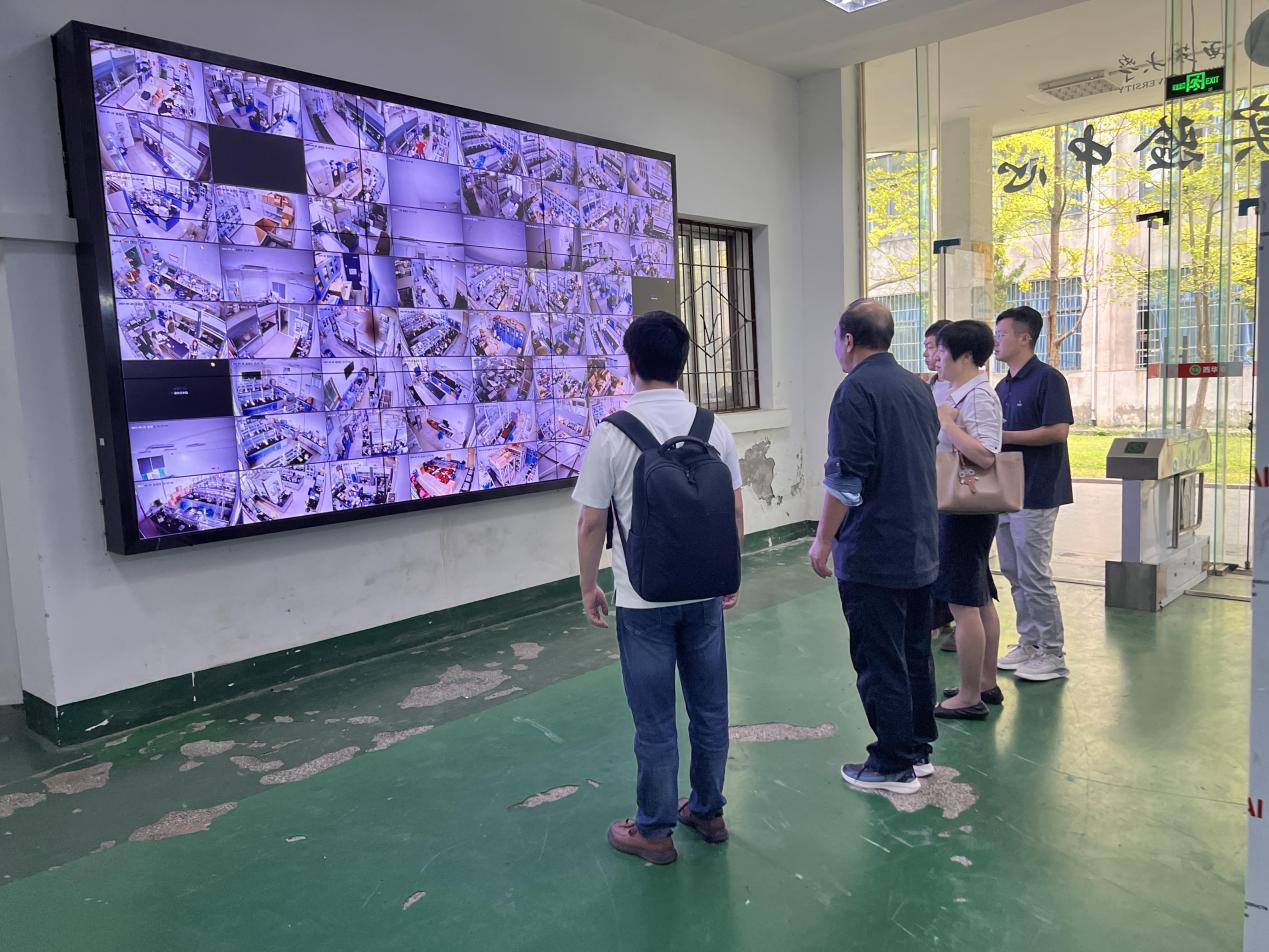 最后,裴峥、王周玉、李会东一起来到监控室,了解监控室运行情况。在监控视频中能实时查看实验室动态,极大程度上避免安全事故的发生。