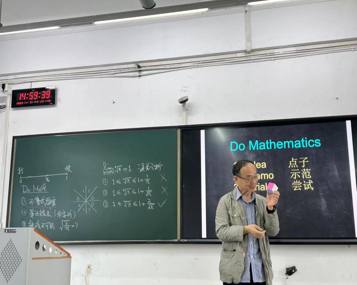 尹景学教授首先解释了“做数学”的概念。他指出,“做数学”是一种强调实践、探索和理解的教学思想,旨在让学生在数学学习过程中不只是接受知识,而是要主动参与其中,通过解决问题、探究规律等方式,深入理解数学概念和原理,培养其创新思维和解决问题的能力。在讲座中,尹景学详细阐述了如何引导学生对数学进行深度思考。他认为,深度思考是理解数学本质和解决问题的关键,需要通过引导学生主动探究、质疑、推理和实践等方式来实现。强调数学教师的角色的重要性,教师应作为引导者和合作者,帮助学生发现问题、解决问题,激发他们的学习兴趣和动力。同时,鼓励老师们在教学过程中积极实践“做数学”的思想,尝试找出新的教学思想和方法,以更好地适应不断变化的教育环境、满足学生的学习需求。他表示,实践是检验真理的唯一标准,只有通过实践才能真正理解和掌握这种教学思想。