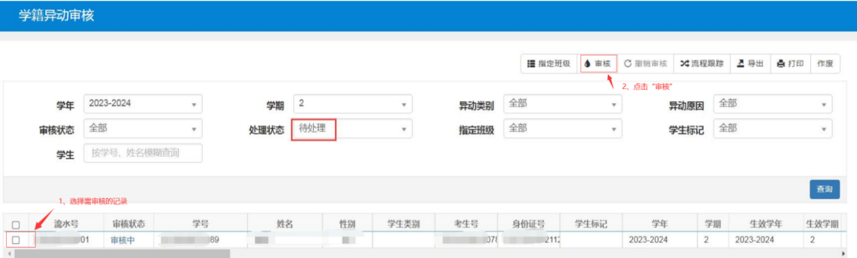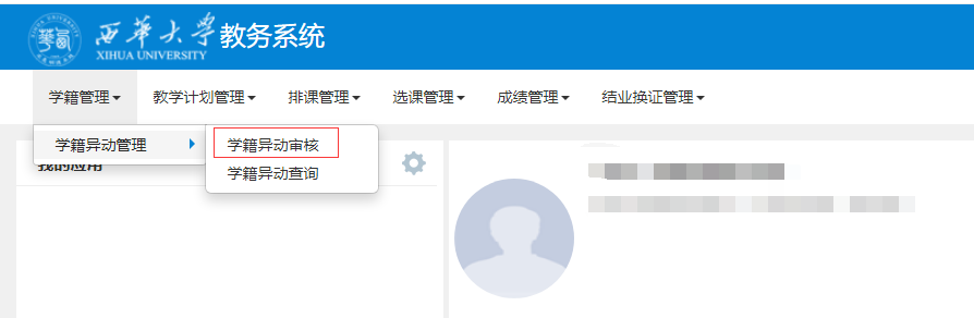 登录教务管理系统(http://jwc.xhu.edu.cn),切换到相应的角色,选择【学籍管理】→→【学籍异动管理】→→【学籍异动审核】。