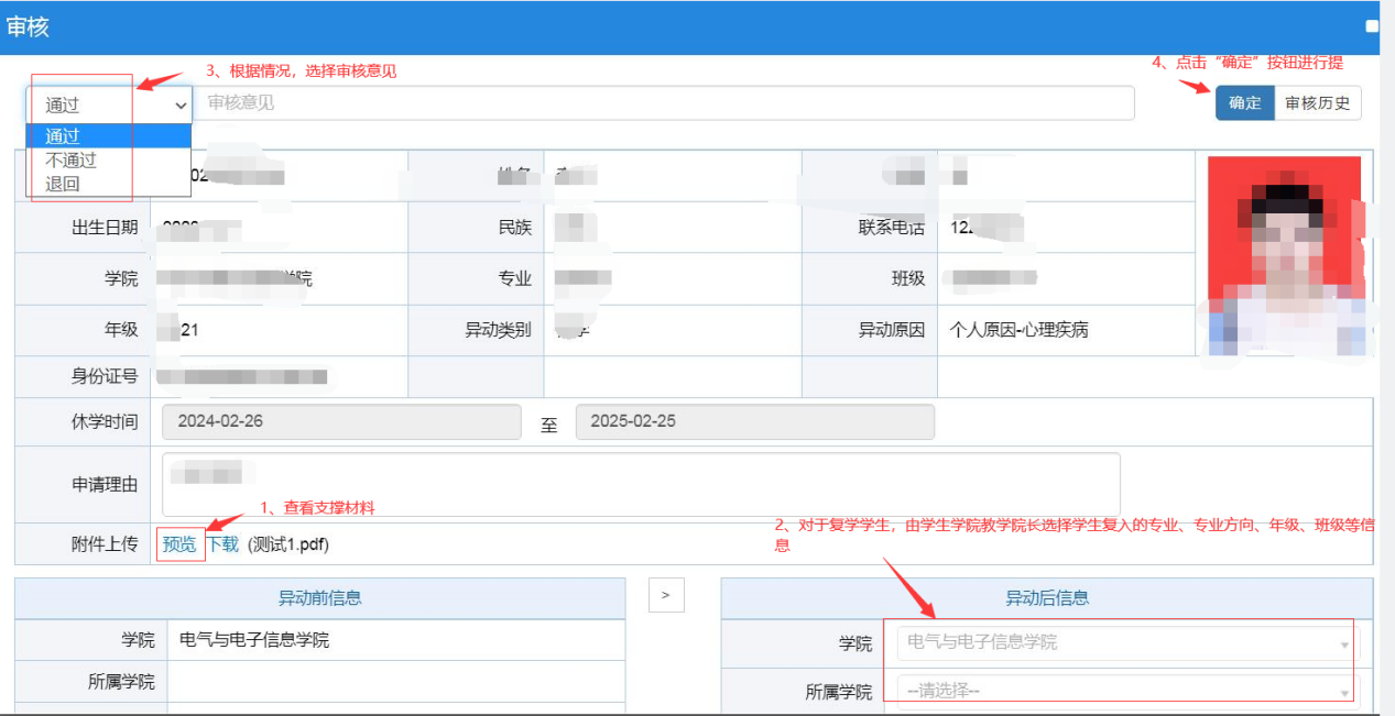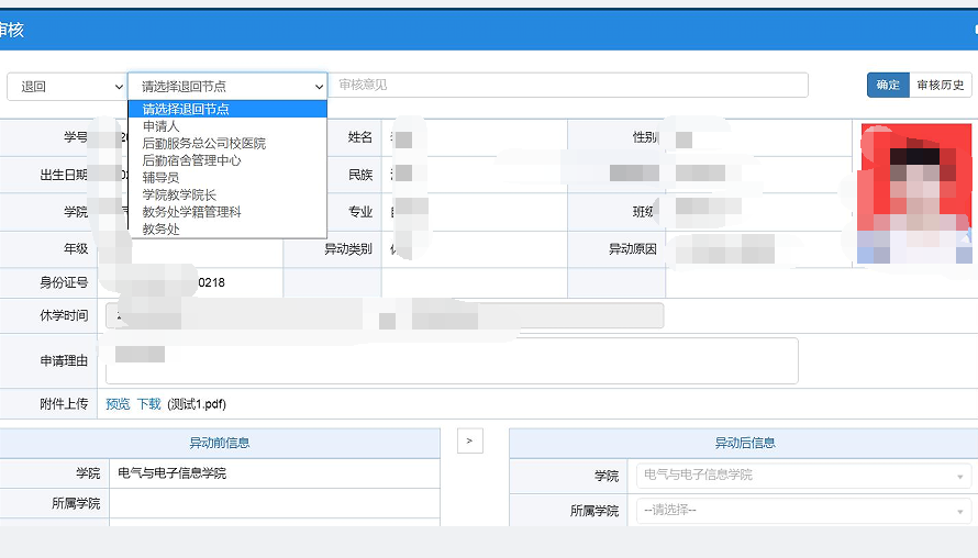 复学申请审核流程:后勤服务总公司校医院→学生学院教学院长→教务处学籍管理科→教务处→教务处学籍管理人员五级审核