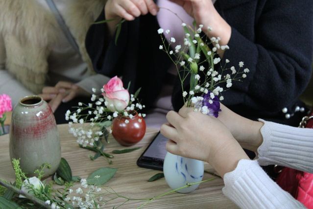 活动中,心社联成员讲解了花的寓意、花束大小、颜色搭配和相关注意事项。参与人员三人一组,边听讲解边操作,用灵巧的双手和创意,将满天星、玫瑰、康乃馨等多种花材修剪、整枝,根据色彩和层次搭配在一起,制作出了蕴含美好祝福的插花作品。