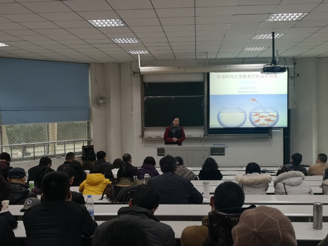 吴教授作以《信息时代大学教育的机遇与挑战》为题的专题学术报告。会议开始,由张岩书记介绍莅临我院的吴志坚教授。吴教授以“当今大学教育模式还能维持多久?”开讲,引发思考。本次报告会,吴教授从当今学习者的特征出发,通过教学数据的展示和亲身经历的教育实例,结合信息技术的发展以及大学教育(特别是数学教育)的现状,分别从教学理念、教学方法以及教学管理等方面,探讨了当今大学教育面临的巨大挑战和机遇。最后,张岩提出“如何把握机遇?”这一问题,吴教授通过举例的形式进行了全面地回答。