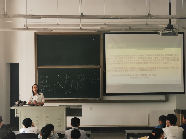何瑞娟老师向大家介绍了各个宿舍的大致情况以及寝室的基本规则。在提到学生宿舍的文化建设时,老师从物质、制度、精神、行为文化四个方面来向大家介绍。紧接着,何老师向同学们讲解了学生宿舍的办事流程,如:寝室调整、物品保修以及充值电费。