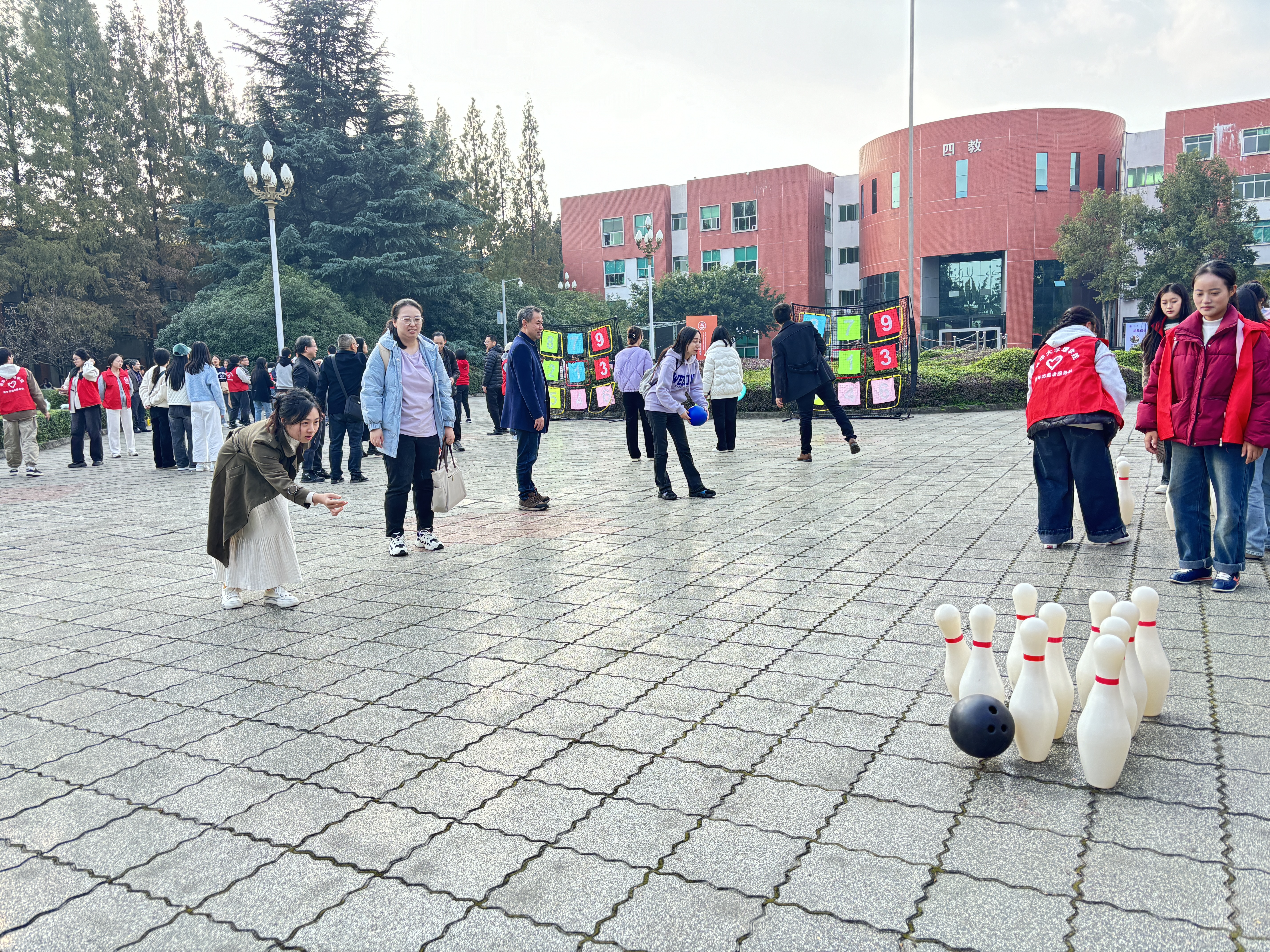 趣味运动会共设快乐飞盘、趣味投篮、迷你保龄球、鼓动人心、金龙钻圈5个项目。过程精彩纷呈,教职工们齐心协力、奋勇争先,现场欢笑声、加油声此起彼伏。