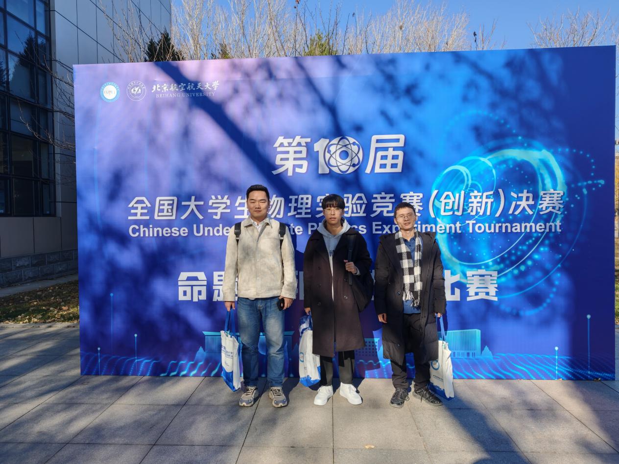 范志祥老师(左1)、郑永祥老师(右1)、罗晨阳同学(中)参加全国大学生物理实验竞赛决赛