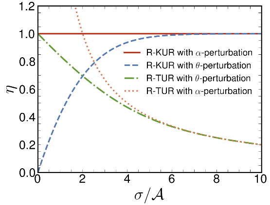 我们在两个例子中检验了我们的R-KUR。第一个例子是一维偏置随机游走,这是一个成功描述生物系统中分子马达动力学的模型,例如在细胞骨架微管上移动的驱动蛋白(如肌动蛋白)。我们通过扰动对称参数θ(这是验证R-TUR所必需的)或扰动反对称参数α(可能会破坏R-TUR)检验了界的效率,该效率应该受到1的上限限制。数值结果如图3所示。显然,我们的R-KUR始终成立,但R-TUR在扰动α时可能会被打破。令人鼓舞的是,带有α扰动的R-KUR在所有参数值下都达到了等式,而带有θ扰动的R-KUR在远离平衡状态下(以大耗散-活性比为特征)趋近等式。第二个例子请参阅我们的文章原文。