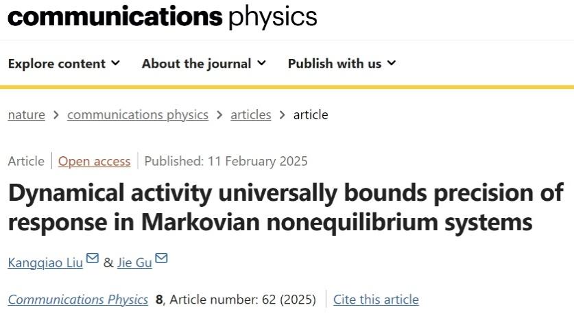 近日,伟德国际1946青年教师刘康桥在物理与天体物理领域TOP期刊Communications Physics (中科院1区TOP,IF:5.4) 期刊发表题为“Dynamical activity universally bounds precision of response in Markovian nonequilibrium systems”的研究性论文。伟德官网为该论文的第一完成单位。伟德国际1946刘康桥博士为该论文的第一作者与共同通讯作者,成都教育科学研究院古杰博士为论文的共同通讯作者。该研究发表后引发广泛关注,受Nature集团Nature Portfolio Communities的邀请,在“Behind the Paper”栏目撰稿分享研究经历。原文链接:https://doi.org/10.1038/s42005-025-01982-w