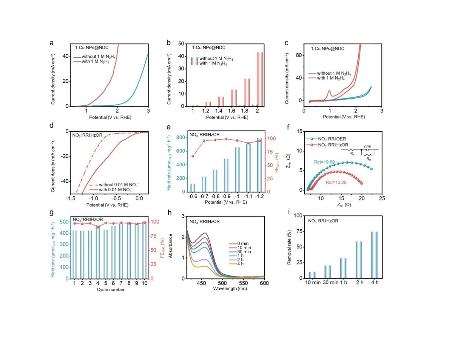 图3. a) 分别在含和不含0.01 M NO3−的0.1 M Na2SO4溶液中,在NO3−RR||OER和NO3−RR||HzOR系统中测试的1-Cu NP @ NDC的LSV曲线。b) 对于NO3−RR||HzOR系统中的电催化NO3−RR,1-Cu NPs@NDC催化剂在不同施加电压下的NH3产率和FENH3。c) 在NO3−RR||HzOR系统中,含0.01M NO3−的0.1 M Na2SO4溶液中,在−0.9 V (vs. RHE)下1-Cu NPs@NDC的阻抗图。d) 在NO3−RR||HzOR系统中进行十次循环测试。e) 不同电解持续时间后,NO3−RR||HzOR系统阳极电解液中N2H4浓度的紫外-可见光谱分析。f) 不同电解持续时间后,NO3−RR||HzOR系统阳极电解液中N2H4的去除率。