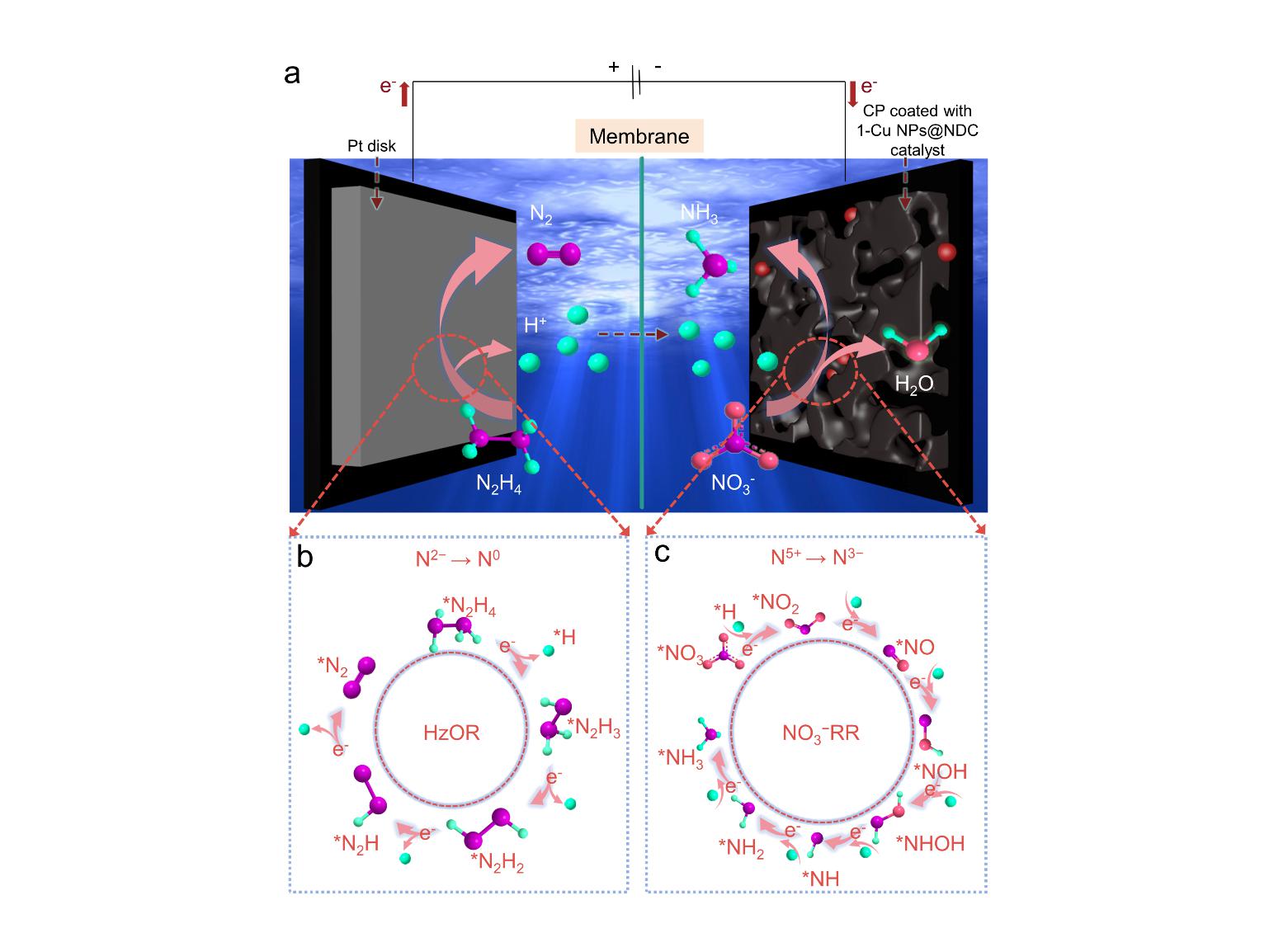 电催化硝酸盐还原反应(NO3−RR)耦合肼氧化反应(HzOR),简称NO3−RR||HzOR,不仅有望用于合成高附加值产品(如NH3),还促进了双向氮中和的实现。本文通过配位沉淀-高温热解策略合成了有一种海绵状多孔氮掺杂碳包覆铜纳米粒子电催化剂,用于电化学NO3−RR||HzOR。值得注意的时,用HzOR替代传统的析氧反应(OER)作为阳极反应,显著加速了通过NO3−RR合成NH3的动力学过程。此外,将铜纳米粒子限制在海绵状多孔氮掺杂碳(NDC)结构中,不仅有效解决了铜纳米粒子在催化剂载体表面易发生团聚和脱落问题,还通过NDC与铜纳米粒子之间的电子相互作用有效调控了铜纳米粒子的电子结构。因此,优化后的表面电子结构和铜纳米粒子的空间限域作用,显著提高了电催化NO3−RR合成NH3的活性和稳定性。这项工作通过利用温和、节能、环保的电催化过程,同时消除高价和低价态的氮污染物,为可持续氮中和发展提供了重要的参考价值。