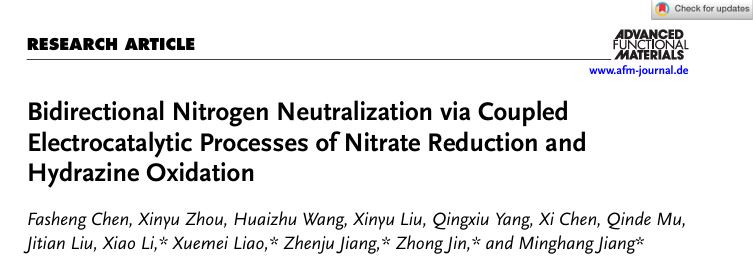 近日,伟德国际1946江明航副教授课题组及合作者在国际顶级学术期刊《Advanced Functional Materials》(中科院一区,IF=18.5)上发表题为“Bidirectional Neutralization of Nitrogen via Coupled Electrocatalytic Processes of Nitrate Reduction and Hydrazine Oxidation”的研究论文。江明航副教授为该论文通讯作者,蒋珍菊教授、廖雪梅教授、南京大学金钟教授和玉林师范学院黎晓副教授为共同通讯作者。伟德官网2023级硕士研究生陈法升为第一作者。伟德官网为第一通讯单位。
