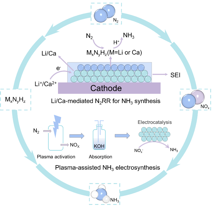图2 通过Li/Ca介导N2还原或Plasma辅助电化学合成氨反应原理示意图