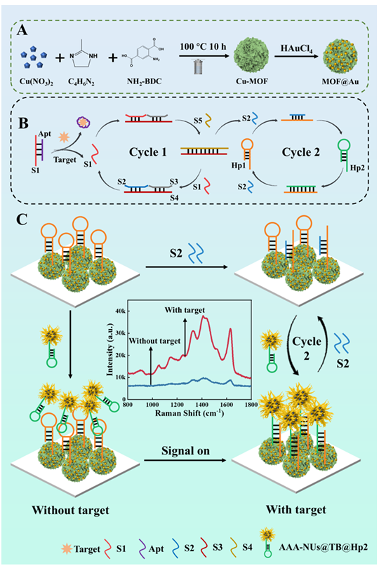 土霉素(OTC)是一种强效杀菌剂,长期服用可能导致肝损伤和其他不良反应。因此,本研究提出了一种Au-Ag纳米海胆作为高效的SERS探针协同层状金属有机框架(MOF)@Au作为SERS底物,以实现食品中OTC的超灵敏检测。首先,合成了金-银合金纳米海胆@甲苯胺蓝(TB)@Hp2(AAA-NUs@TB@Hp2)作为高效的SERS信号标签,由于其具有丰富的丰富,可以产生大量的“热点”,从而产生强烈的拉曼信号。此外,具有高比表面积的层状MOF可以固定大量的Au NPs和HP1(MOF@Au@Hp1),并作为SERS衬底,从而提高了传感器的灵敏度和均匀性。在OTC的存在下,基于熵驱动DNA反应和催化发夹组装(CHA)的无酶双循环扩增策略被激活,导致AAA-NUs@TB@Hp2与MOF@Au@Hp1相结合,可以显著放大局部电磁场,协同增强TB拉曼信号。相反,OTC的缺失会阻碍AAA-NUs@TB@HP2和MOF@Au@Hp1之间的结合,致使拉曼信号可以忽略不计。基于该原理,该生物传感器对OTC具有较高的灵敏度,检测限低至6.97 × 10-15 mol/L,同时在食品中抗生素检测具有重要的应用前景。