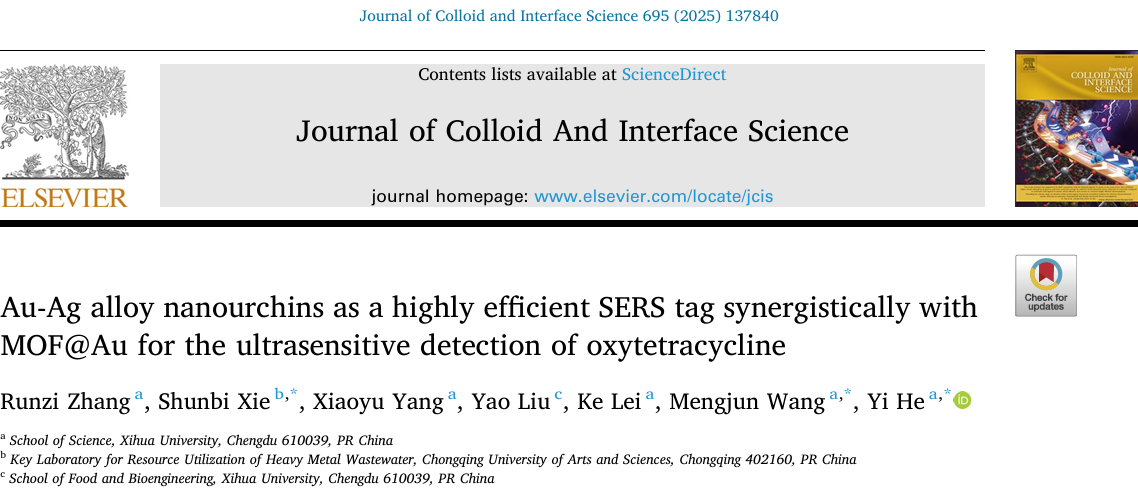 近日,伟德国际1946何毅博士在化学Top期刊《Journal of Colloid And Interface Science》(中科院一区,IF: 9.4)发表题为“Au-Ag alloy nanourchins as a highly efficient SERS tag synergistically with MOF@Au for the ultrasensitive detection of oxytetracycline”的研究性论文。伟德官网2023级研究生张润滋为第一作者,何毅博士为该论文的通讯作者,伟德官网为第一通讯单位。