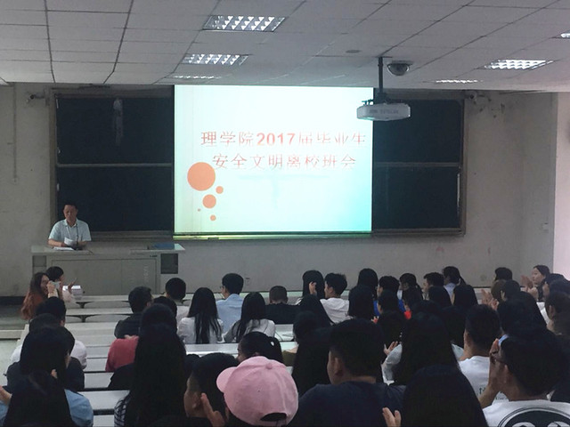 首先,王筱莹老师上台讲话。她强调,毕业生离校教育是大学生思想政治教育的重要组成部分,是大学生走向工作岗位前的重要教育环节,对大学生顺利毕业起着至关重要的作用,并为大家说明了2017届学生毕业离校时间及有关工作进度安排。随后,王婕老师就毕业生人身财产安全、自我行为规范、毕业生诚信教育等方面为大家做了详细的讲解。她希望毕业生加强自身安全意识,严于律己,不酗酒闹事,不打架斗殴,积极参加学院组织的各类活动,为自己的大学生活划下圆满的句号。接着,杨玉强老师上台,给大家详细讲解了毕业离校需要办理的各类手续和毕业生信息档案的建立。他强调:毕业生离校一定要仔细地填写和检查自己的各类信息档案,信息档案的准确不仅关系到毕业工作的顺利进行,还将影响毕业生今后各项生活工作。