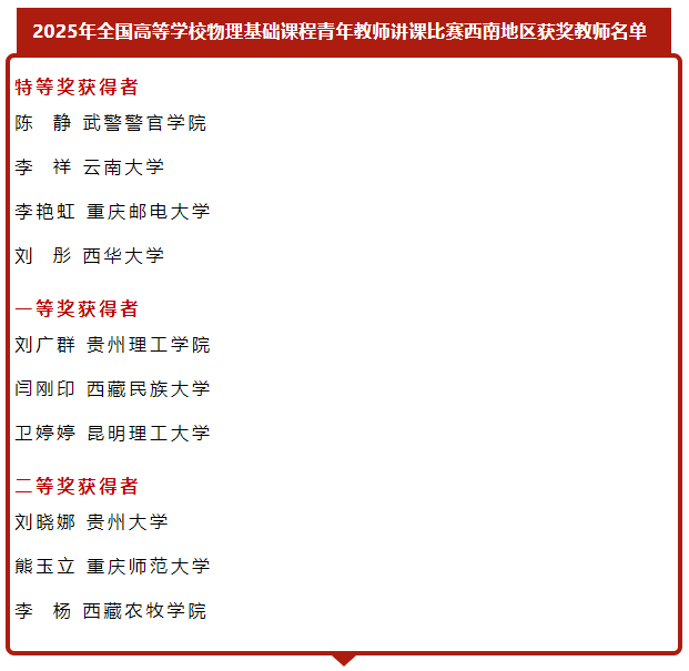 6月28至29日,2025年AI赋能大学物理教学研讨会暨全国高等学校物理基础课程青年教师讲课比赛西北、西南地区复赛在陕西省渭南师范学院隆重举行。我院青年教师刘彤凭借扎实的专业知识、精湛的教学技艺和出色的现场表现,一路过关斩将,最终荣获西南地区复赛特等奖。