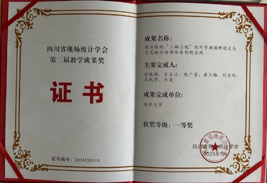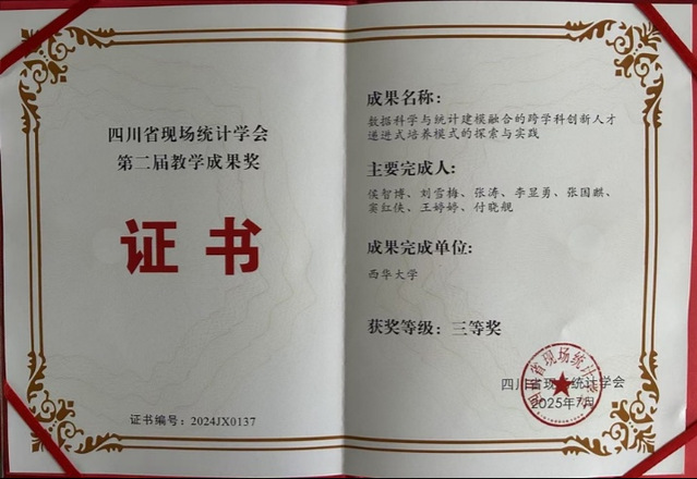 2025年7月4日至6日,由中国现场统计研究会资源与环境统计分会、四川省现场统计学会联合主办,西南交通大学数学学院承办的“2025统计与数据科学创新发展研讨会”在成都召开。伟德国际1946数学学科教师团队应邀参会,并在会议首日斩获三项省级教学成果奖:徐艳艳老师团队获四川省现场统计学会教学成果一等奖、晏力老师团队获教学成果二等奖、侯智博老师团队获教学成果三等奖。这一成就不仅彰显了学院的教学水平,还为后续人才培养注入动力。
