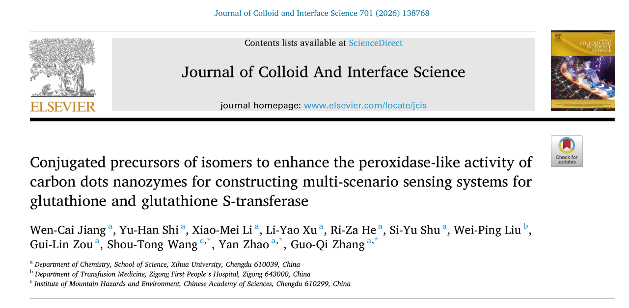 近日,伟德国际1946张国麒团队在国际权威期刊《Journal of Colloid and Interface Science》(中科院一区Top,IF=9.7)上发表了一项题为“Conjugated precursors of isomers to enhance the peroxidase-like activity of carbon dots nanozymes for constructing multi-scenario sensing systems for glutathione and glutathione S-transferase”的研究性论文,伟德官网2023级化学专业研究生蒋文彩为第一作者,张国麒博士、赵艳教授为该论文的通讯作者,伟德官网为第一通讯单位。