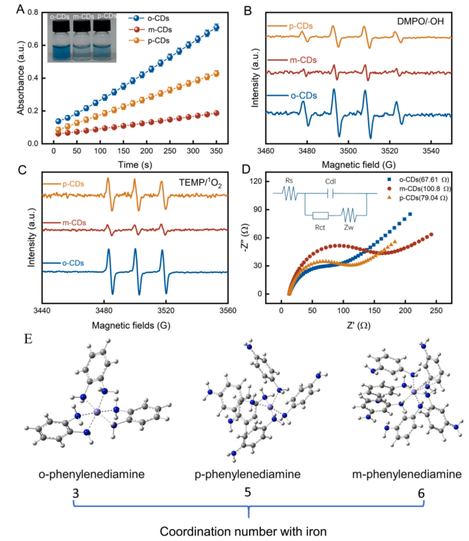 图3 (A) o-CDs、m-CDs和p-CDs在652nm处随时间的吸光度变化曲线。(B,C)产生⋅OH和1O2的 EPR谱图。(D) o-CDs、m-CDs、p-CDs的EIS图。(E) DFT测定邻苯二胺、间苯二胺和对苯二胺与Fe的配位数。