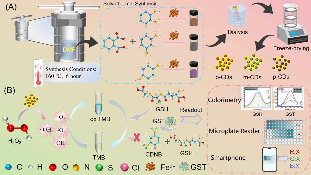 谷胱甘肽(GSH)和谷胱甘肽S-转移酶(GST)是人体内重要的生物标志物。GSH水平异常与肝损伤、肾癌和糖尿病并发症密切相关。例如,肝癌患者体内的GSH水平比健康人低40-60%。GST活性升高则往往表明对抗肿瘤药物产生耐药性。传统的检测方法存在局限性:ELISA法操作复杂、耗时较长;色谱法需要昂贵设备;常规比色法易受干扰。该研究团队致力于开发一种简单、成本低、灵敏度高的方法,满足实验室高精度、临床高通量和现场便携式检测等不同场景的需求。通过调控共轭前驱体异构体结构,优化得到以邻苯二甲酸和邻苯二胺为前驱体,采用溶剂热成功地合成了具有良好催化活性和高稳定性的CDs纳米酶,显著增强了CDs纳米酶的过氧化物酶样活性,并成功构建了适用于实验室、临床和现场检测的多场景传感平台,用于谷胱甘肽(GSH)和谷胱甘肽S-转移酶(GST)的高灵敏度检测。