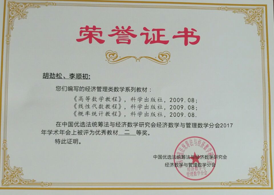 喜讯: 我校教材在中国优选法统筹法与经济数学研究会经济数学与管理数学分会2017年学术年会上被评为优秀教材二等奖