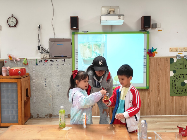 志愿者和小朋友一起做“海底火山大爆发”实验