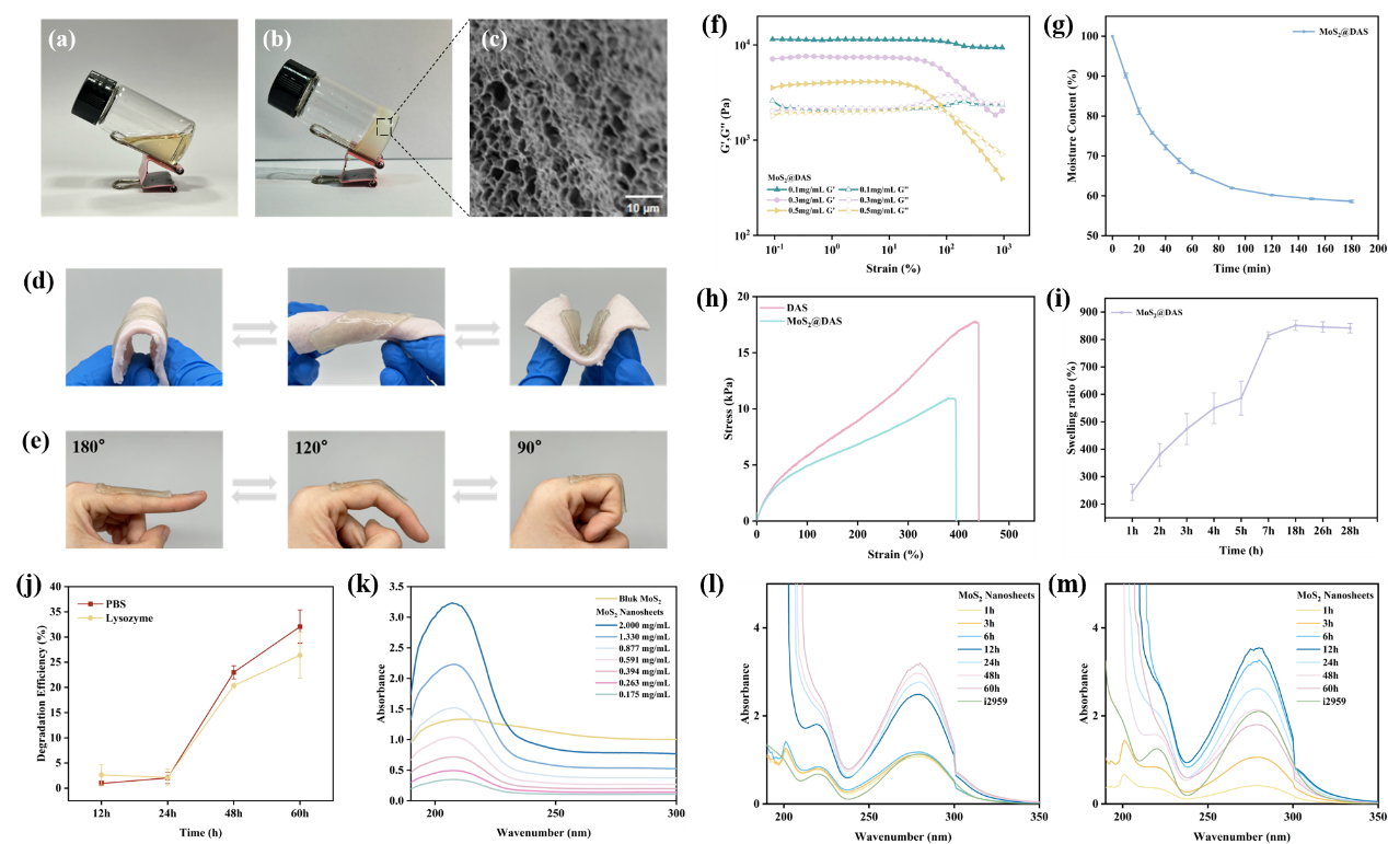 MoS₂作为一种具有优异理化特性的二维纳米材料,在生物医学领域极具应用潜力,但 Bulk MoS₂固有的层间堆叠结构使其在水溶液中分散性差、易团聚和高毒性,严重限制了其临床转化。本团队创新性地采用多巴胺甲基丙烯酰胺(DMA)和甲基丙烯酰氧基乙基磺基甜菜碱(SBMA)对 MoS₂纳米片进行表面修饰,通过 π-π 堆积和静电相互作用的协同效应,实现了 MoS₂纳米片的高效液相剥离与胶体稳定。这种表面工程策略不仅显著提升了 MoS₂的分散性和生物相容性,还通过与丙烯酰胺(AM)的自由基共聚,构建了稳定的水凝胶网络。该水凝胶具有较好的粘附特性,能与人体组织紧密结合,同时其机械模量可匹配生物组织,适配不规则伤口表面,为后续治疗功能的发挥奠定了坚实基础。