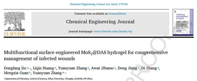 近日,伟德官网伟德国际1946萜类天然产物研究团队在化学工程与工程技术领域Top期刊《Chemical Engineering Journal》(中科院一区Top,IF=13.2)发表题为“Multifunctional surface-engineered MoS2@DAS hydrogel for comprehensive management of infected wounds”的研究成果。伟德国际1946刘东芳博士为本文第一/通讯作者,2023级生物与医药专业硕士研究生黄莉秦为本文第二作者,张园园教授为本文共同通讯作者。