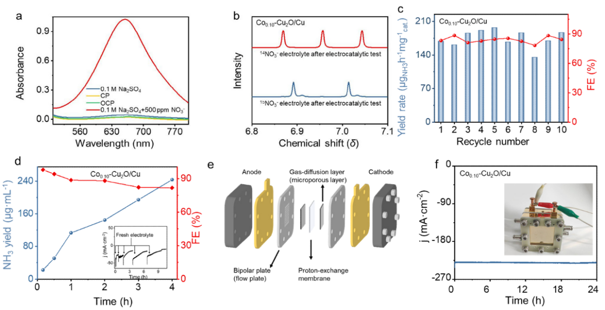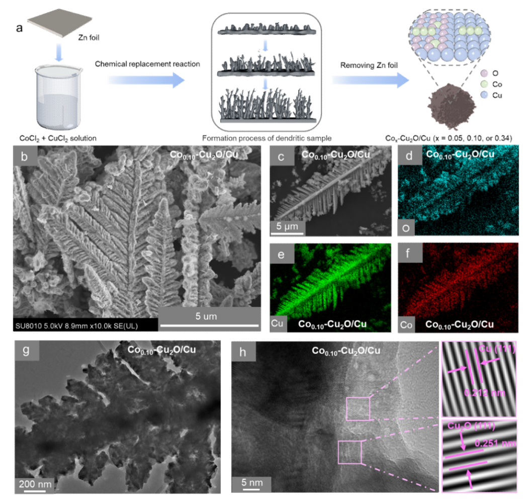 氨(NH₃)是氮肥、医药及其他重要工业产品生产过程中的关键基础化学品. 本文旨在通过电催化硝酸盐还原反应(NITRR),将环境中的硝酸盐污染物转换为具有附加值的NH₃,既解决了硝酸盐污染的问题,又实现了氮资源的循环利用. 然而,电化学NITRR涉及复杂的多电子转移反应步骤和缓慢的动力学过程. 同时,竞争性析氢反应(HER)和含氮副产物的产生,导致额外的电能消耗,降低了NITRR产NH₃的选择性和能量效率. 因此,设计和制备具有高选择性NITRR电催化剂,仍然是电催化领域的热点研究课题。目前,铜(Cu)基催化剂由于其独特的外层电子构型(3d10),是实现高选择性电催化NITRR为NH3最具潜力的电极材料。然而,Cu基材料对水分子活化产活性氢(*H)的能力较弱,从而阻碍了电化学NITRR过程中所必需的*H产生的动力学过程。鉴于钴(Co)基催化剂有利于水分子活化产生*H, 故利用Co掺杂Cu基催化剂调节电化学NITRR过程中*H浓度,以提升NH₃的产率和选择性是本文的主要研究思路.