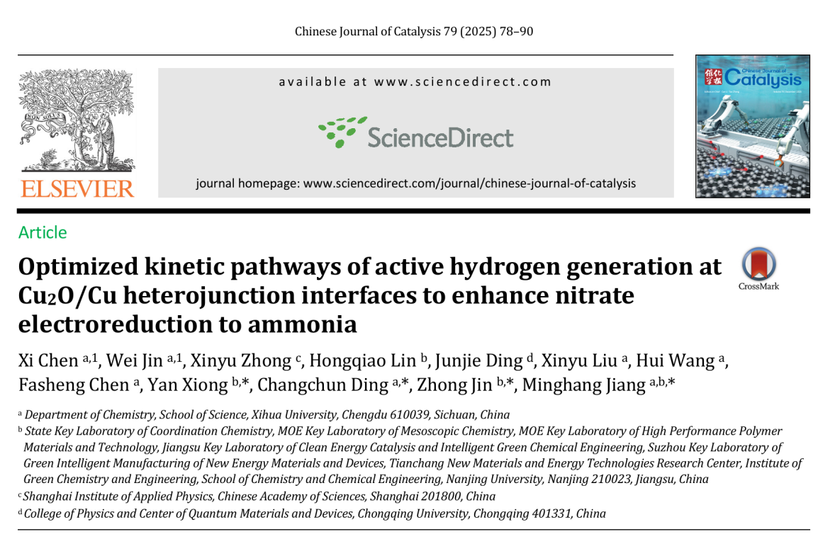 近日,伟德国际1946江明航副教授课题组及合作者在国际TOP期刊《Chinese Journal of Catalysis》(中科院一区,IF=17.7)上发表题为“Optimized kinetic pathways of active hydrogen generation at Cu2O/Cu heterojunction interfaces to enhance nitrate electroreduction to ammonia”的研究论文。江明航副教授为该论文通讯作者,丁长春副教授,南京大学金钟教授和熊衍研究员为共同通讯作者。2023级硕士研究生陈羲和金伟博士为共同第一作者。伟德官网为第一通讯单位。