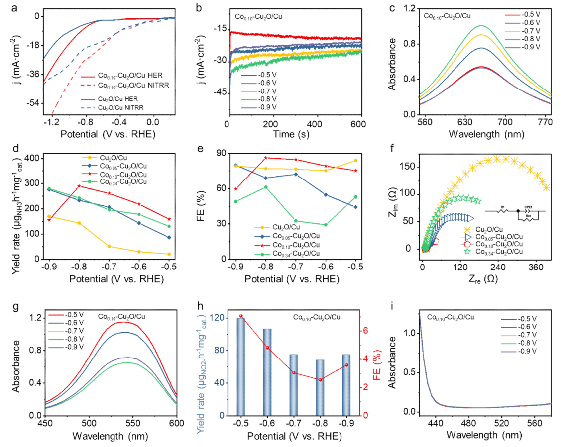 本文通过一种简单、快速、环境友好且无能耗的化学置换法,制备了一系列具有不同Co掺杂浓度的纳米枝晶状Cu2O/Cu异质结材料(Cox−Cu2O/Cu, x = 0.05、0.10或0.34)。通过调控Co的掺杂浓度,成功实现了Cu₂O/Cu异质结界面处Co掺杂形式从原子态向单质态的可控转变。实验结合理论计算研究表明,掺杂原子态Co增强了硝酸根反应物种在催化剂表面的吸附强度,而掺杂单质态Co有利于*H的生成。*H是NITRR合成NH3的关键活性物种,其浓度对FENH3有显著影响。具体来说,*H的浓度不足会减缓NITRR产NH3的动力学过程,而浓度过高则会诱发剧烈的HER副反应,导致产NH3的选择性降低。因此,调控Cu基催化剂表面的*H浓度,使其在NITRR产NH3过程中达到产生和消耗之间的动态平衡是至关重要的。因此,我们通过对纳米枝晶状 Cu2O/Cu 异质结材料中掺杂Co浓度的调节,实现了Co掺杂形式(原子态和单质态)比例的调控,从而能有效地调节枝晶状Cu2O/Cu异质结材料界面处*H的浓度。得益于Cu2O/Cu 异质结界面处*H浓度的调节,使得电化学NITRR产NH₃过程中*H的产生和消耗之间维持了动态平衡,从而显著促进了电化学NITRR产NH₃的动力学过程。基于上述优势,所制备的Co0.10-Cu2O/Cu催化剂在-0.7 V vs RHE的电压下,电化学NITRR为NH3的产率为290.0 μmol·h⁻¹·mg⁻¹cat,法拉第效率(FENH3)为86.2%,其性能显著高于初始的Cu2O/Cu催化剂的性能(NH3的产率为51.0 μmol·h⁻¹·mg⁻¹cat.,FENH3 = 32.5%)。此外,Co0.10-Cu2O/Cu催化剂表现出显著的稳定性,在连续的循环稳定性测试和长时间耐久性评估中,其催化活性无明显衰减。
