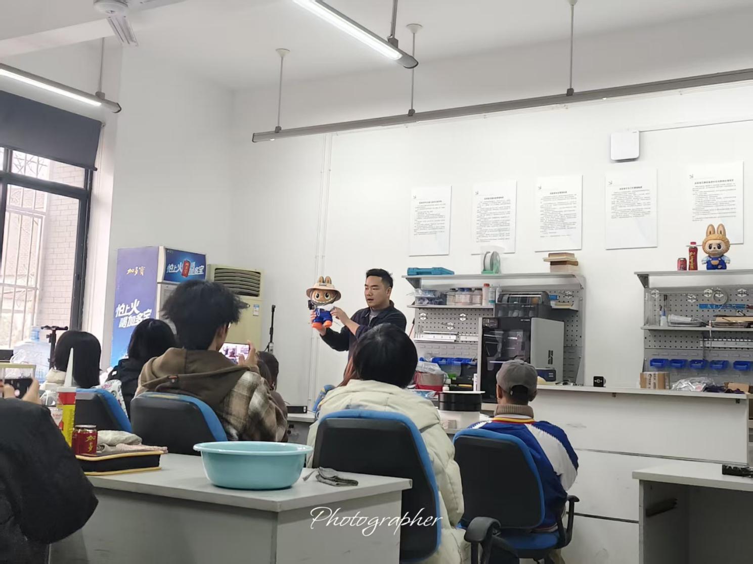 活动现场,范志祥老师以 “技术落地与趣味实践” 为核心,围绕三大特色内容展开讲解,让抽象的物理原理与前沿技术变得鲜活可感。在 3D 打印文创模块,范老师从设备操作、材料特性等基础内容入手,重点展示了热门 IP “拉布布” 的 3D 打印全过程,结合模型结构讲解了 “分层打印” 背后的物理逻辑,让同学们直观看到 “虚拟设计如何变成实体文创”;进入 “3D 打印 + 智能硬件拼装” 环节,范老师讲解了智能遥控叉车与遥控货车两款作品,讲解了电机、遥控器与打印部件的适配原理,线路连接与功能调试具体做法,并引导大家思考 “如何通过 3D 打印定制化解决硬件安装的适配难题”;而在磁悬浮灯泡展示环节,范老师先是让灯泡点亮的同时并 “悬浮”,引发全场好奇,随后结合电磁感应、力的平衡等物理知识,通俗讲解悬浮原理。
