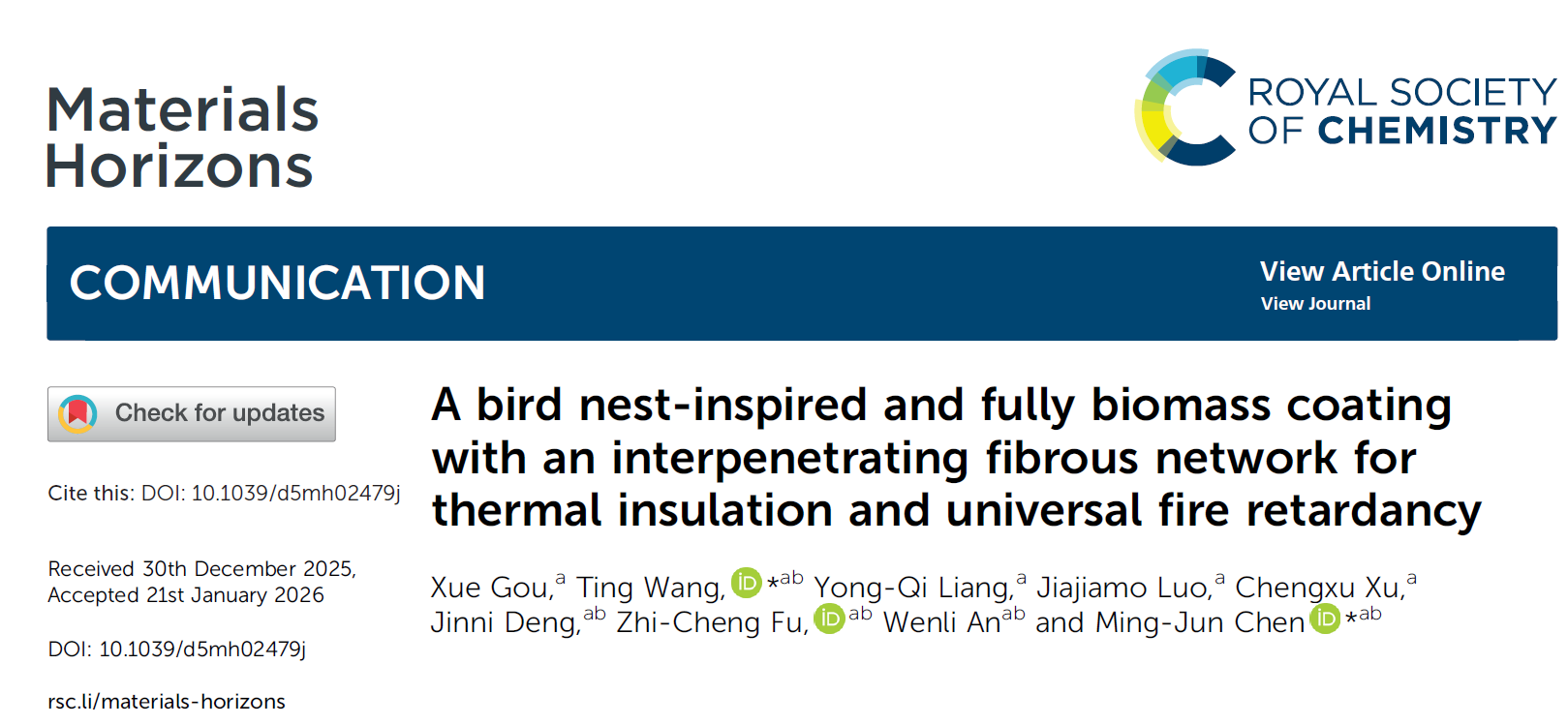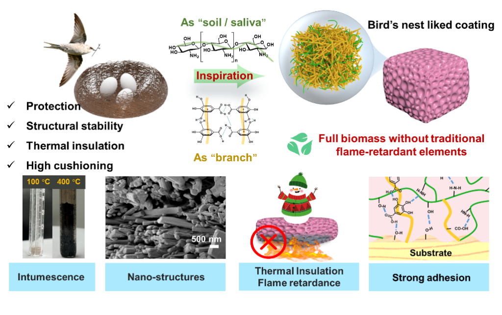针对传统保温材料在阻燃改性恶化力学性能和保温性能的矛盾问题,且传统阻燃涂层与基材粘结力弱,易导致涂层剥离丧失阻燃性的难题,课题组受鸟类筑巢行为的启发,通过绿色多基团协同策略构建了一种不含传统阻燃元素的全生物质基防火涂料,实现了"一石多鸟"的效果。其中,没食子酸通过π-π堆积超分子纤维聚集体,模拟结构"细枝";壳聚糖则通过复制"唾液"的粘合功能增强内聚力,两者组装形成具有纳米孔洞的互穿网络微结构。涂覆到聚氨酯硬泡上,其能赋予材料优异的隔热性能(24.85 mW·m-1k-1)和力学性能(压缩模量9.37 MPa)。得益于丰富的界面粘附基团和增强的内聚力,该涂层对多种基材均表现出强附着力。此外,脱羧/碳化过程与酚羟基自由基捕捉能力的协同作用,使材料具有膨胀阻燃行为和广谱阻燃特性。这项工作为开发具有巨大应用潜力的多功能阻燃涂料建立了一种简便环保的设计策略。
