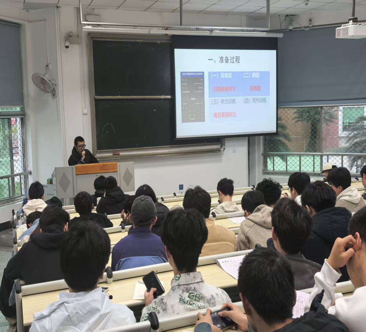 分享会上,四位同学结合自身备考经历,从不同角度分享了他们的心得与策略。钟昊城同学从整体备考规划与应试心态调整方面给出了建议。他系统性地展示了自己的阶段性复习计划表,强调了合理规划、持之以恒的重要性。同时,他结合自身考试经历,提醒同学们在考场上需保持平和心态,学会时间管理,遇到难题时懂得灵活应对,确保整体得分最大化。龙维同学则深入剖析了阅读理解与长篇阅读的解题技巧。她将阅读题型分类拆解,分享了如何快速定位关键信息、分析长难句结构以及合理分配答题时间的心得。她特别指出,培养逻辑思维和把握文章主旨的能力远比盲目刷题更为重要。唐翔龙同学推荐相关的学习材料,并指出以真题为中心,将教辅材料作为补充和扩展,通过持续积累和主动练习,将输入的知识转化为自己的输出能力。干乐聪同学重点分享了词汇积累与听力训练的“持久战”方法。他强调,词汇是根基,推荐利用碎片化时间结合APP与真题语境进行记忆。针对听力部分,他建议同学们坚持每日精听与泛听相结合,逐步适应语速与各类口音,并详细讲解了如何利用真题进行听写和跟读练习。