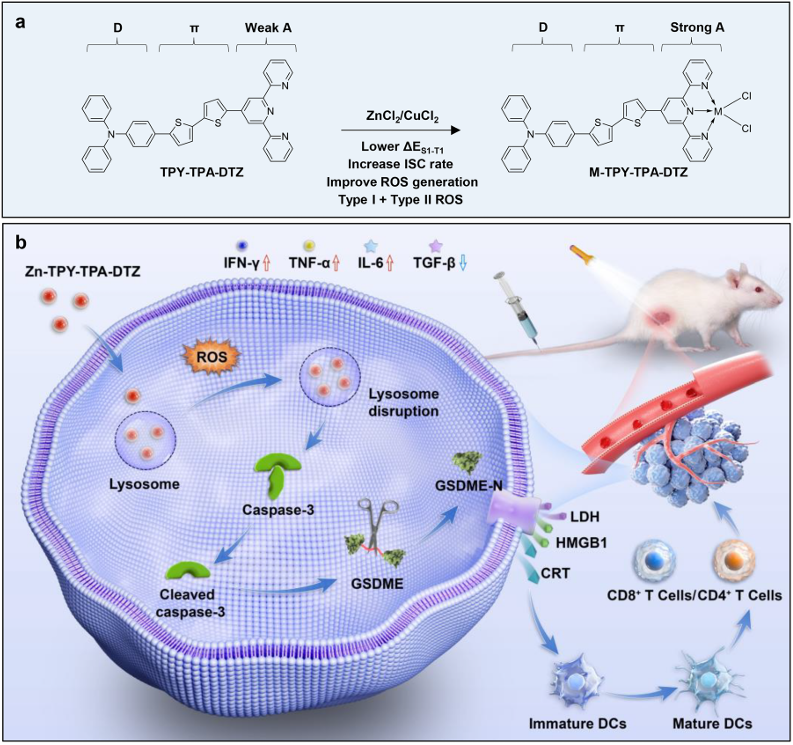 光动力疗法(PDT)因其时空精准、副作用小等优势,已成为肿瘤治疗的重要武器。然而,实体瘤内部普遍存在的 “乏氧”和“免疫抑制”微环境,严重削弱了其疗效。传统光敏剂主要通过消耗氧气的II型机制发挥作用,同时单纯的细胞杀伤难以激活有效的抗肿瘤免疫,甚至可能加剧免疫抑制。团队首次利用生命必需金属 Zn²⁺作为强吸电子基团,优化光敏剂分子的电子结构,合成一种显著提升活性氧(尤其是I型ROS)效率的Zn-TPY-TPA-DTZ分子,该分子通过I型(电子转移)和II型(能量转移)双机制产生活性氧,其光毒性在常氧和乏氧环境下均保持高效,性能显著优于临床常用光敏剂Ce6;Zn-TPY-TPA-DTZ还能特异性靶向并破坏肿瘤细胞溶酶体,进而激活Caspase-3/GSDME介导的细胞焦亡通路并重塑免疫微环境,形成系统性的长效免疫监视,有效抑制肿瘤生长、复发与转移,为设计高效、安全、能克服乏氧的金属基光敏剂提供了全新的理论框架和普适性策略,更成功地将化学驱动的精准光动力治疗与生物体内系统的免疫激活深度耦合,实现了从“局部杀伤”到“全身免疫”的协同跃升。
