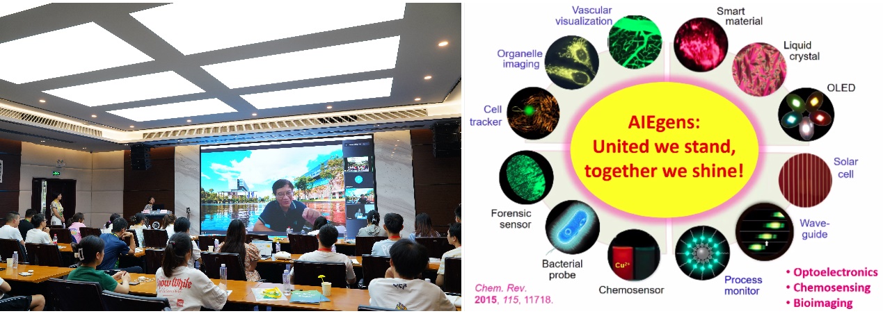 唐本忠院士以传统聚集诱导荧光淬灭(Aggregation-caused quenching, ACQ)入题,生动形象地解释了聚集诱导发光(Aggregation-Induced Emission, AIE)的原创概念及发光机制。紧接着,通过生动的图文实例介绍了AIEgens在细胞器成像、癌细胞/细菌/病毒识别与跟踪、肿瘤治疗等领域的广泛应用,展示了近年来研究团队在AIEgens结构创新、细胞器共定位能力提升、抗光漂白、延长激发/发射波长、增大Stokes位移、降低生物毒性等方面的瞩目成果。最后,唐院士总结了AIE材料的独特优势并致谢研究团队成员。与会师生均对唐本忠院士的报告内容十分感兴趣,现场争相提问,气氛活跃,唐院士就大家提出的问题一一耐心作答。