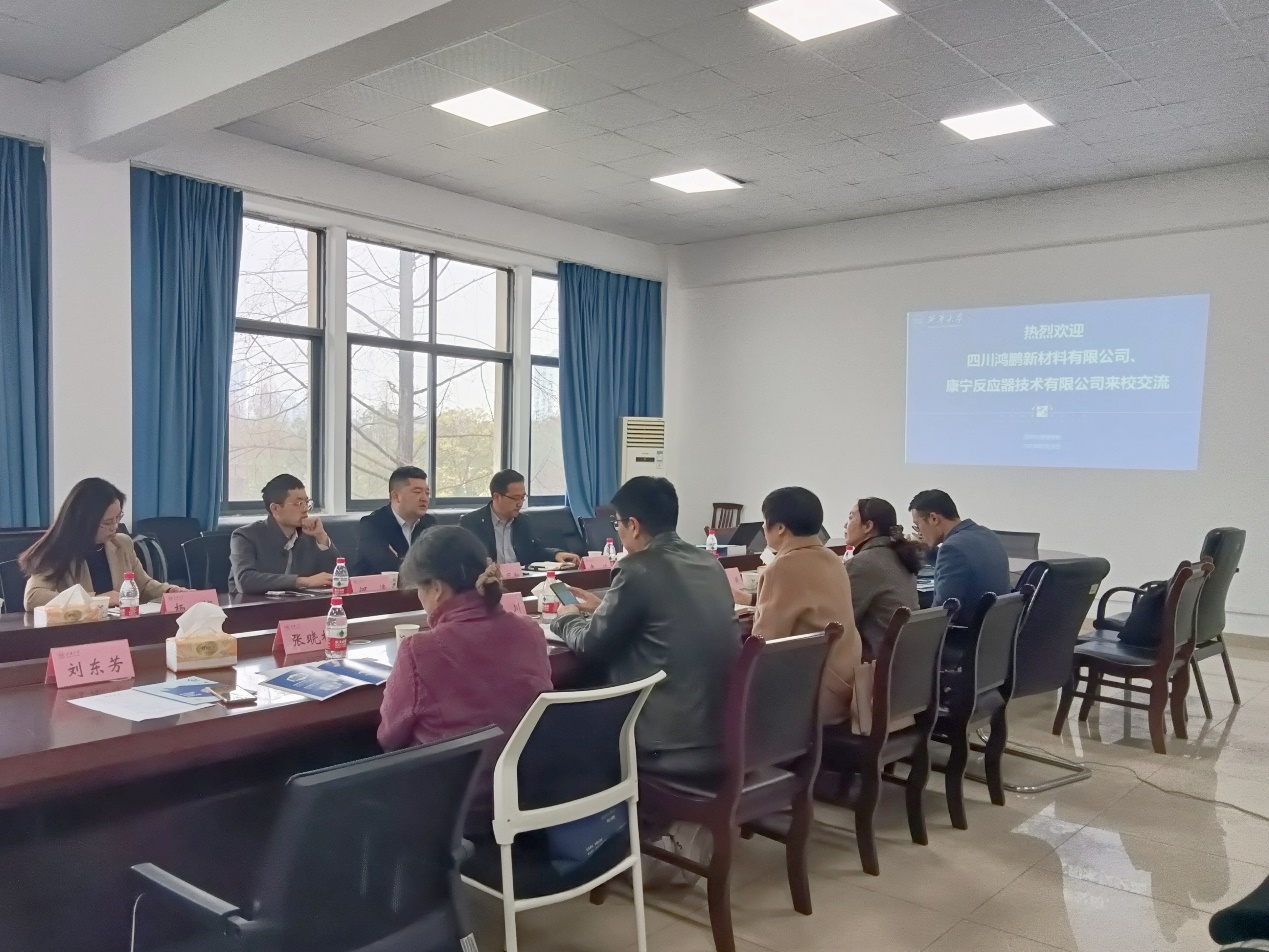 会上,王周玉院长首先代表学院对本次到访的企业领导表示热烈欢迎,并向在场的公司代表介绍了我院的整体发展情况,重点讲解了化学学科的发展现状和化学学科在连续流微反应领域的人才培养、科学研究。紧接着,四川鸿鹏新材料有限公司黄凤翔总经理和康宁反应器技术有限公司何涛经理分别介绍各自公司的情况。随后校企三方围绕人才供需对接、产教融合人才培养、共建实习实践基地、围绕连续流微反应领域开展科研合作等事宜进行了深入交流,在多方面达成了共识,纷纷提出了富有建设性的意见和建议。