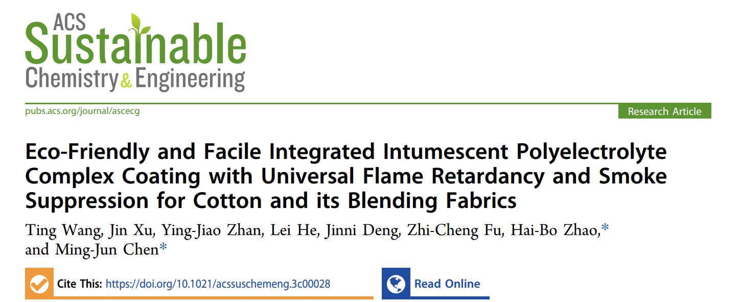 对混纺织物表面进行阻燃处理是最常用的阻燃方法,发展绿色环保、操作方便的涂层阻燃技术是当前研究的热点。陈明军教授课题组致力于发展基于水相的环保型聚电解质凝聚体阻燃技术,汪婷博士等人在此基础上研发了以生物质和水处理剂为原料的环保型聚电解质凝聚体,通过pH调控可两步获得透明阻燃涂层,对棉织物、涤/棉二元混纺织物和涤纶/维纶/棉三元混纺织物均可实现阻燃,其极限氧指数值高达27.5%~28.5%,总释放烟气抑制率高于40%。该涂层阻燃技术不仅绿色环保、操作简单,还表现出一定范围的阻燃普适性,被发表在化学领域TOP期刊ACS Sustainable Chemistry & Engineering上,DOI: https://doi.org/10.1021/acssuschemeng.3c00028。