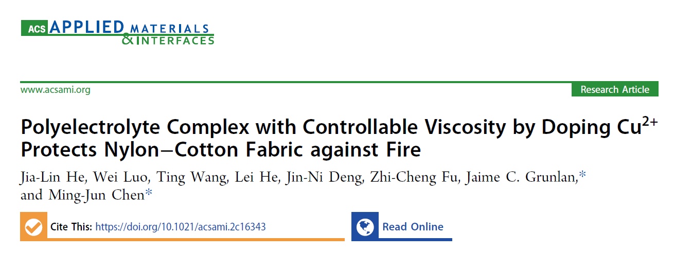 然而,上述工作仍然难以实现锦/棉混纺织物的阻燃。何佳璘同学等人基于团队在过渡金属调控膨胀阻燃行为(Compos. Part B-Eng., 2023, 253, 110539; Compos. Part B-Eng., 2019, 175, 107189-107201; Ind. Eng. Chem. Res., 2015, 54, 12705-12713; RSC Adv., 2017, 7, 35619-35628.)的研究基础上,发展了一种新型的Cu2+掺杂聚电解质凝聚体,通过Cu2+实现对外在离子对和内在离子对的调控,获得粘度可调的聚电解质涂覆液,仅0.067 wt%的Cu2+含量即可实现对锦/棉混纺织物的阻燃。该项工作被发表在材料科学领域TOP期刊ACS Applied Materials & Interfaces上,DOI: https://doi.org/10.1021/acsami.2c16343。
