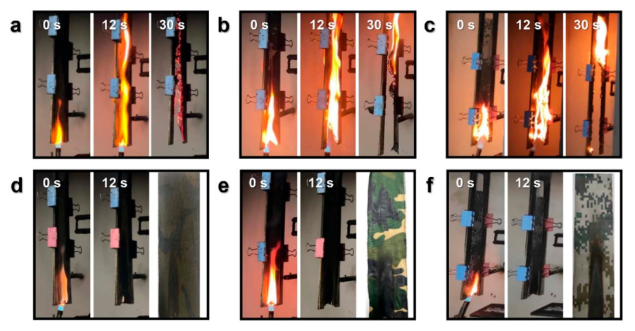 棉织物、涤/棉混纺织物以及涤纶/维纶/棉混纺织物未经阻燃处理时的燃烧测试照片(a-c)和经阻燃处理后的燃烧测试照片(d-f)