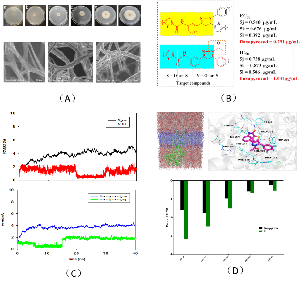 为了发现琥珀酸脱氢酶(SDH)新型杀菌剂,设计、合成并表征了36个新型4,5-二氢吡唑环-呋喃/噻吩甲酰胺衍生物,通过单晶X射线衍射测定了化合物5l的晶体结构。测试了这些化合物对五种植物病原真菌的抗真菌活性:Botrytis cinerea, Pyricularia oryzae, Erysiphe graminis, Physalospora piricola and Penicillium digitatum。结果表明,在20 µg/mL时化合物5j,5k,5l对番茄灰霉病菌具有优异的抗菌活性效果,EC50值分别为0.540、0.676、0.392 µg/mL,表现出比市售杀菌剂氟吡菌酰胺更好的抗菌效果(EC50 = 0.791 µg/mL)。同时,评估了化合物5j,5k,5l对SDH的抑制活性。结果表明,这些化合物表现出优异的抑制酶活性,IC50值分别为0.738、0.873、0.506 µg/mL,显示出比氟吡菌酰胺更好的抑制活性(IC50 = 1.031 µg/mL)。计算机模拟结果表明,化合物5l对SDH的结合能力强于氟吡菌酰胺,进一步验证了目标化合物设计的科学性和合理性。提供了具有潜在应用价值的候选化合物,为新型杀菌剂的研究与应用奠定了一定的基础。