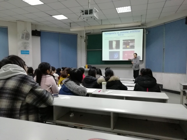 报告开始,王玉兰教授向同学们介绍了Michael Winkler教授。本次报告的题目是Keller Segel系统的空间同质性有多不稳定?——取决于两维高维抛物椭圆型情形。会上,教授讲道:研究抛物-椭圆趋化方程组许多解的爆破性。分别考虑在空间维数不同的情况下,对于初值的不同要求从而证得方程组的许多解是爆破的。其中就要利用拓扑学、Bernstein-type理论、局部爆破准则等方法来解决相应的问题。最后,教授给出了课堂一开始所出题目的答案:恰好在质量水平高于$m_c$时,($\star$)的恒定稳态具有极端不稳定性,在如此强烈的意义上排斥任意浓度增加的扰动,使得相应的轨道在有限时间内崩溃。到了同学们提问环节时,同学们积极配合,教授也一一进行回答。至此,本次报告会全部结束。