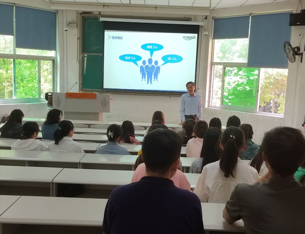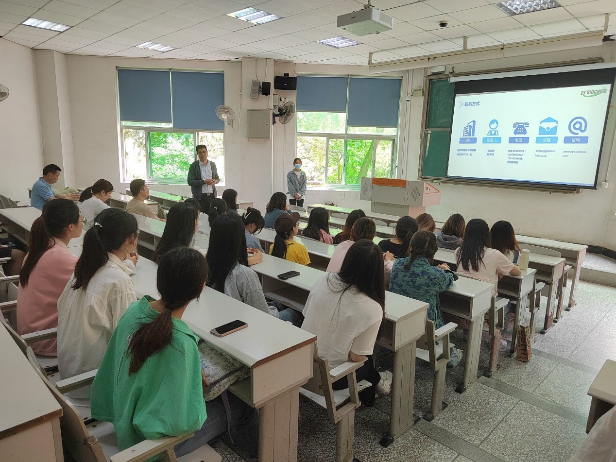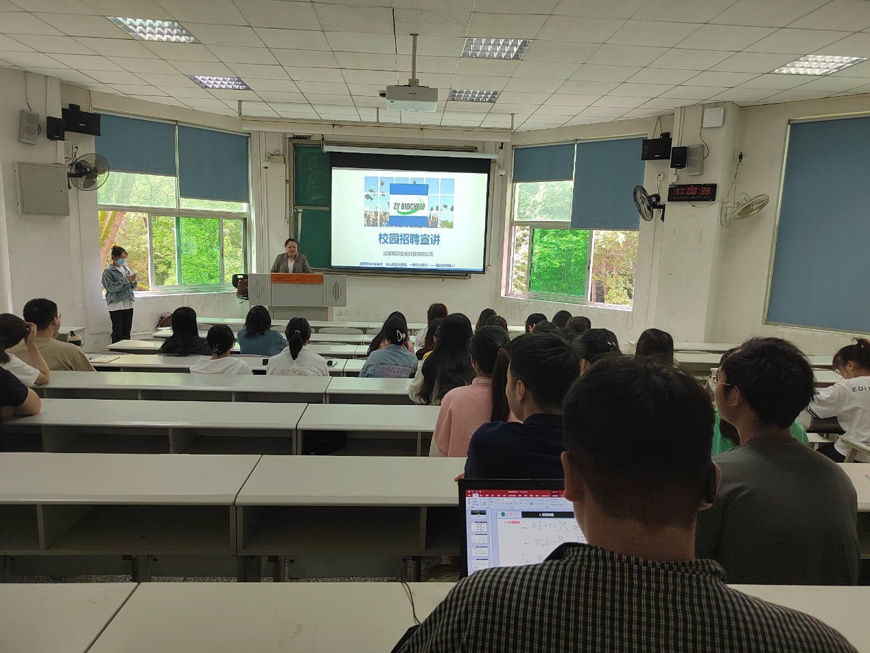 宣讲会上,成都郑源生化科技有限公司工作人员首先围绕企业整体情况、职业发展与福利、岗位需求、应聘方式四个方面进行讲解;重点介绍了薪酬结构、员工福利、人才发展通道、岗位需求等内容,并告知相关的应聘流程。随后,郑思贵谈道:公司的初心就是做最好的多肽原料供应商,希望同学们加入到郑源科技这个大家庭。最后,周川指出:毕业生同学要抓住机会,积极投递简历,参与应聘;低年级同学要提前谋划,为未来顺利进入职场做好准备。