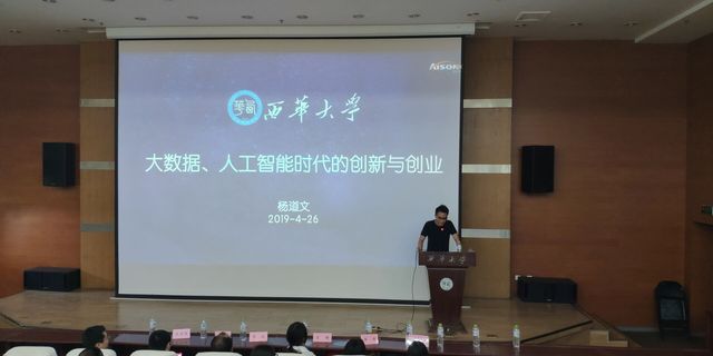 主讲人是瀚维科技有限公司执行董事兼总经理移动互联网、大数据领域持续创业者杨道文。首先,杨道文总经理简要介绍了自己的工作,再谈及自己对主题“人工智能下的创新创业”的理解。他提到,我们正处于一个快速变革的时代,我们正在跨向一个大繁荣时代,我们正经历一个以需求为主导的时代,在这个智能的时代,掌握庞大的数据就意味着抓住发展时机,只要顺势而为,将创新创业与时代相结合。与此同时,他强调,创业需要拥有行业积累量,以时间换空间,把握大的趋势和方向,一步一个脚印。最后,他向同学们提出几点希望:永远保持诚信,善于总结并且敢于承担责任,不是因为成长才去承担,而是因为承担才会成长。